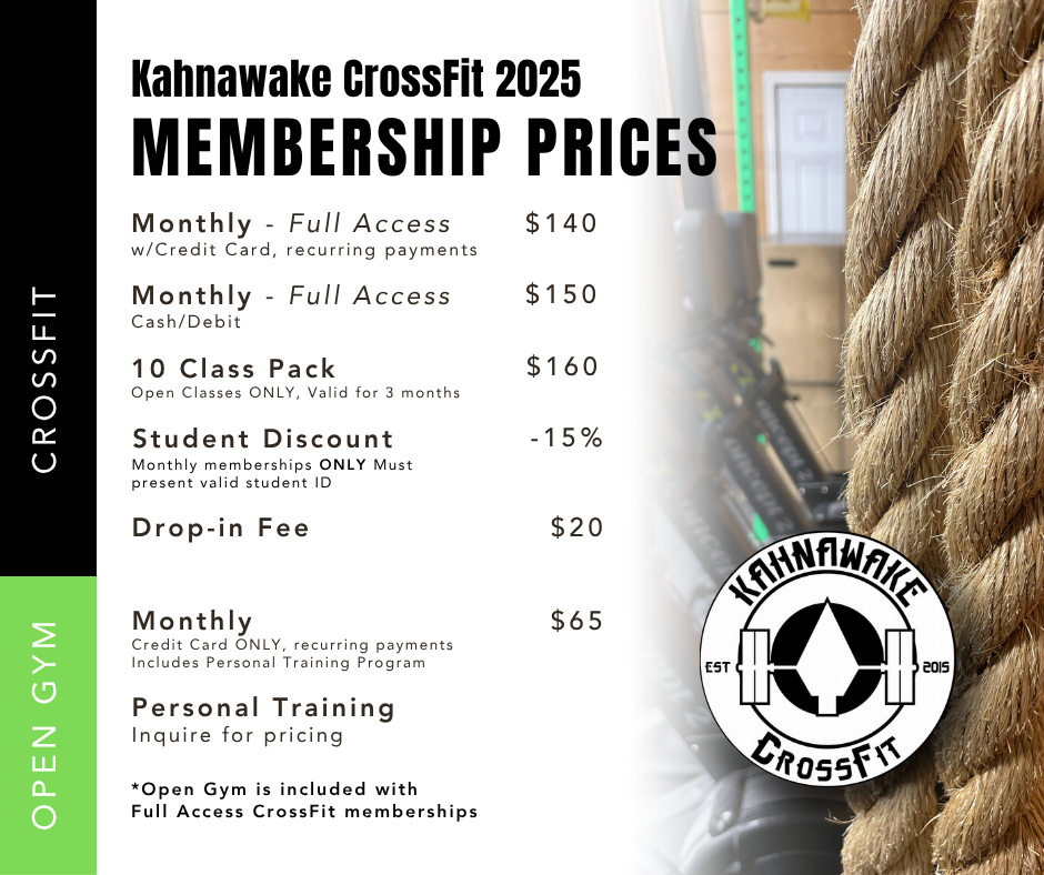 Open Crossfit Membership, monthly membership that gives full access (includes all Crossfit classes and weight room) – $150 per month or $140/month via Credit Card