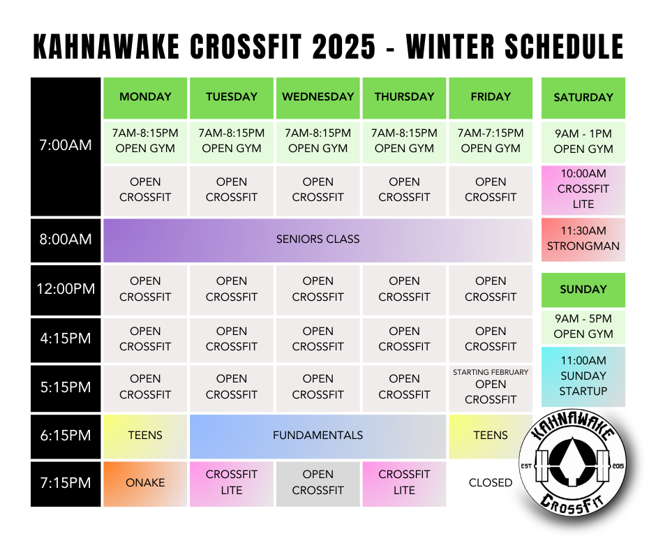 Sponsored Community Classes : Seniors Crossfit, Teen Crossfit, Crossfit Lite Beginners for women, Fundamentals Beginners, Sunday Start-up, Crossfit Kids, Specialty Classes (Olympic Weightlifting, Strongman) (Sponsorship is available to Indigenous residents of Kahnawake only.)